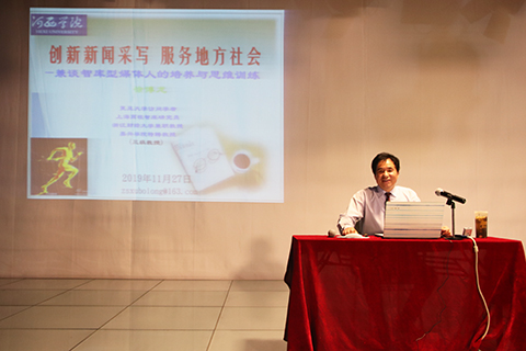 报告会上,徐博龙教授以自己的亲身经历为基石,就“创新新闻采写,提高服务地方社会能力”“培养爱国情怀,提高新闻采访能力”“养成良好习惯,提高自觉行动能力”“善于独立思考,提高发挥想象能力”、“注重知识积累,提高创新协作能力”五个方面作了深入浅出的讲解。徐博龙教授指出:一篇好的新闻稿,首先要有好的题材。这就要求记者必须具备较好的社会活动能力、敏锐观察事物的能力、分析问题的能力和文字表达能力,多观察、多留心、多收集素材。同时,要多关心政治时事,“吃透两头”,要经常深入实际、深入群众,深入基层,及时准确地把握领导和群众普遍关注的热点、难点问题,提升新闻的真实性、准确性和及时性。