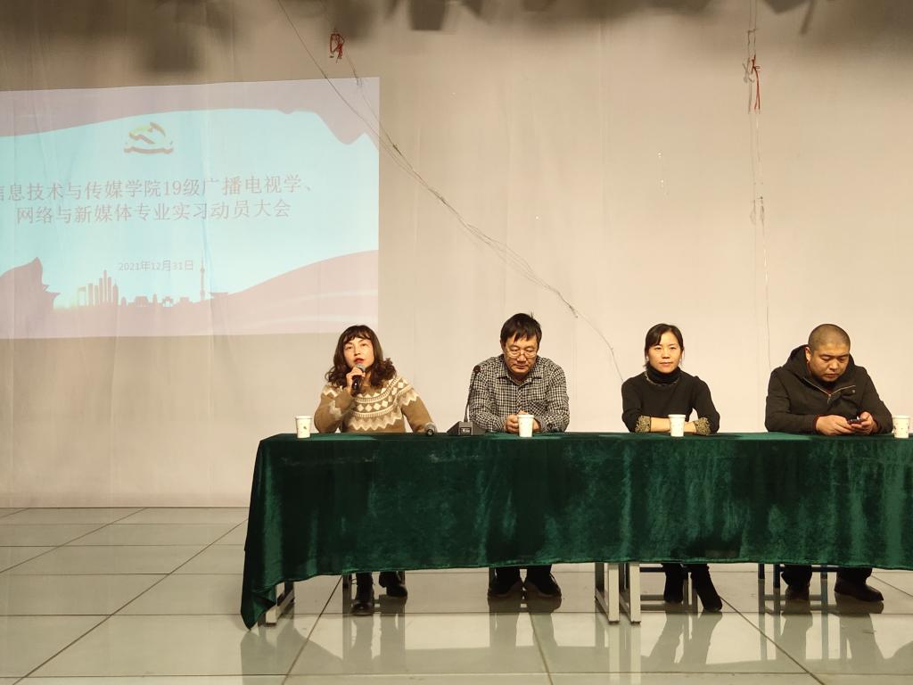 为了进一步做好员工实习工作,引导员工做好实习前的各项准备,推进实习工作的顺利开展,公司于12月31日下午4点30在信传楼三楼演播厅召开伟德国际victor194619级广播电视学、网络与新媒体专业实习动员大会。会议由新媒体教研室主任郭炳老师主持,伟德国际victor1946副经理徐有芳老师、广电教研室主任任婧老师、李文学老师以及19级广播电视学、网络与新媒体专业全体同学参加。