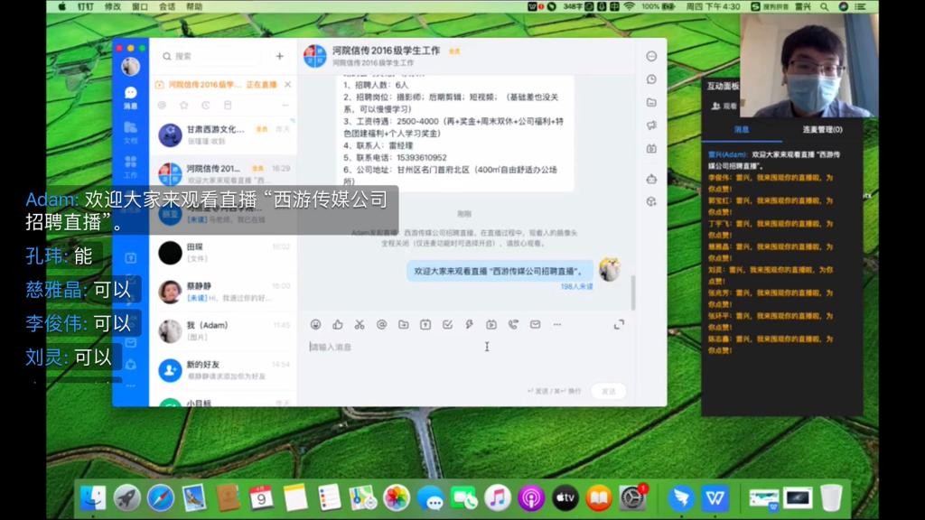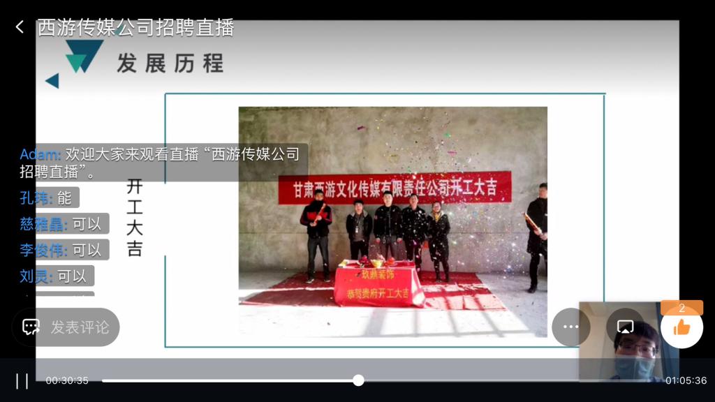 招聘会依托“陇政钉”政务移动办公平台,通过线上直播模式进行。宣讲环节,用人单位全面介绍了关于我们、组织架构、发展历程、工作环境、招聘岗位、薪资待遇、未来战略目标等内容,展示了公司近5年与各大高校、企事业单位合作完成的各类项目宣传片和影视作品,并提供了摄影、短视频制作、后期剪辑等6个就业岗位。交流环节,员工们积极提问,就普遍关注的福利政策、晋升机制、发展空间等细节问题进行了详细咨询和互动交流。